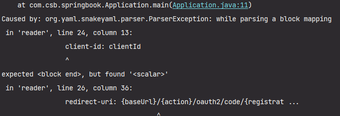 책의 예제인 .properties를 .yml파일로 바꿔서 적용 시키고 있었는데, 메인 어플리케이션 구동시, 자꾸만 yaml파일 parsing error를 내뱉었다.
