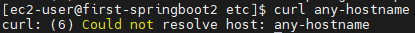 호스트네임이 제대로 적용되지 않은 경우를 테스트하기 위하여, 임의의 호스트네임으로 curl 호출을 해보면,
