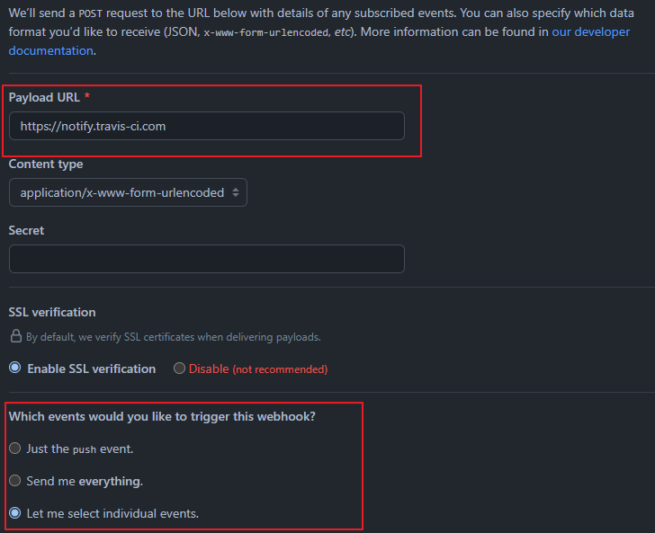 Payload URL : webhook POST request를 받을 서버 URL이다. https://notify.travis-ci.com 을 입력해준다.