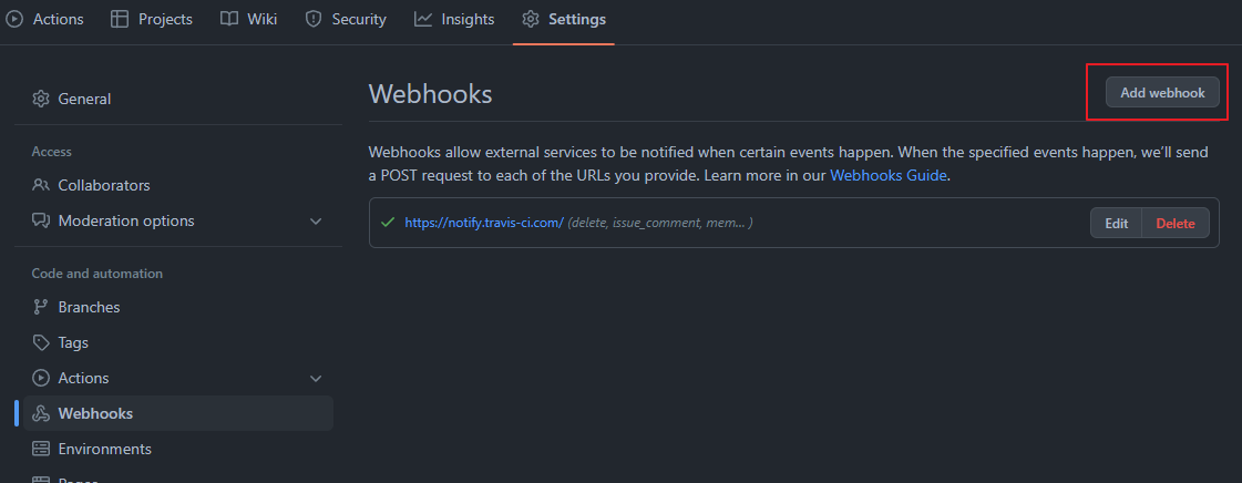 레포지토리 설정에서 아래 사진과 같이 webhook을 설정하면 된다.