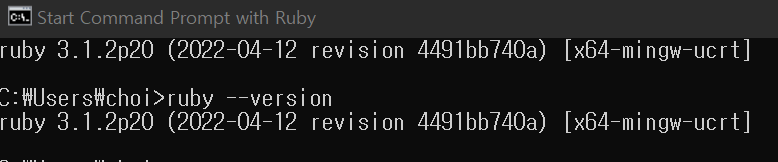 ruby --version을 쳐서 아래와 같이 버전 정보가 나오면 루비가 정상적으로 설치되었다는 뜻이다.