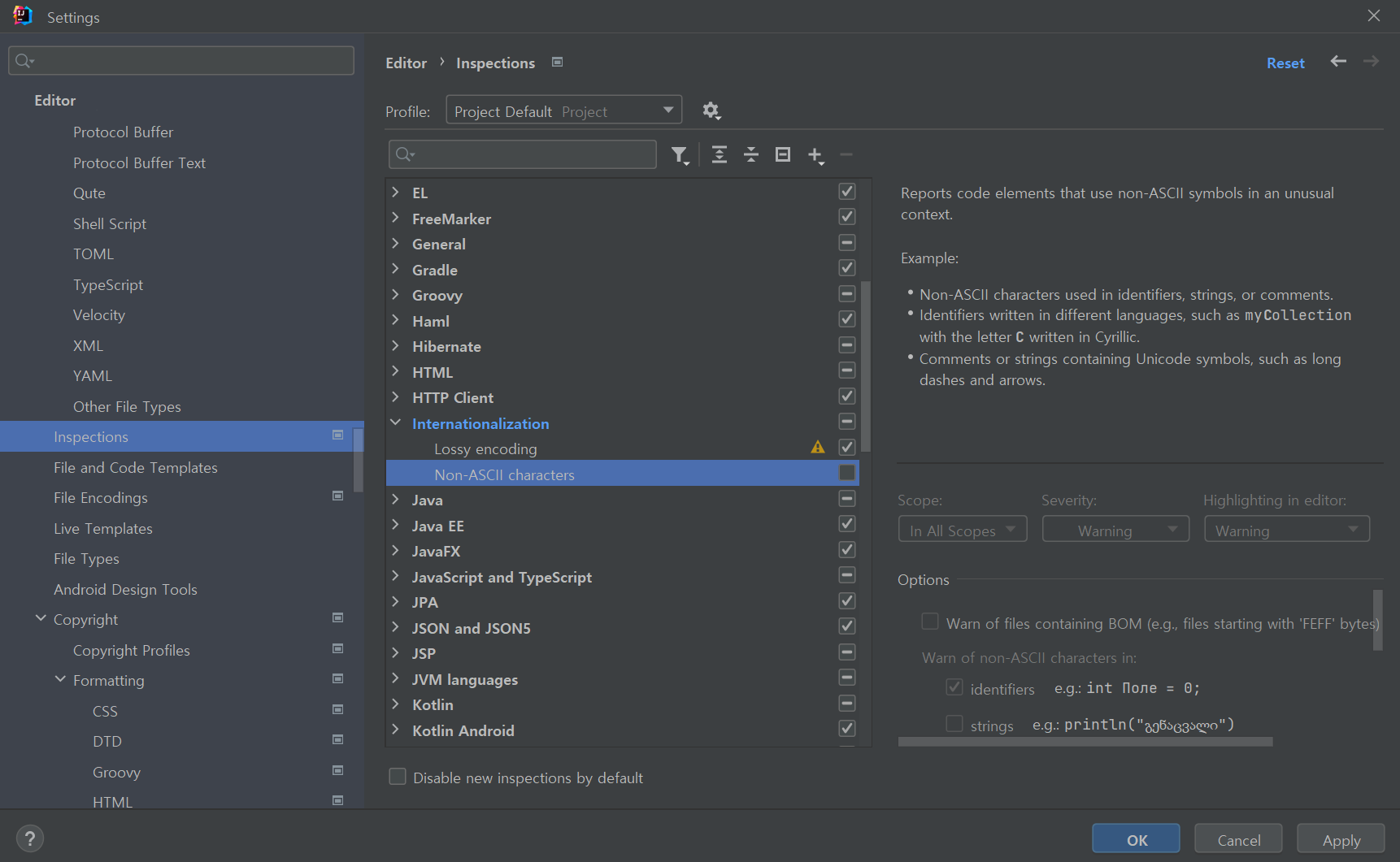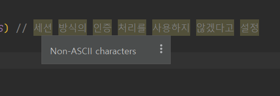 Editor > Inspections 에서 아래 사진과 같이 Non-ASCII characters 에 체크를 해제 시켜준다.