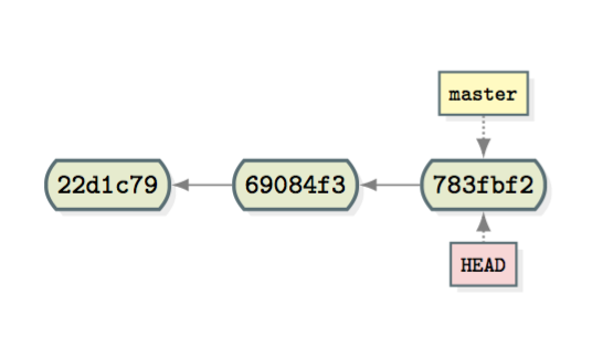 상황1. 뭐가 잘못된 것 같은데, 무슨 문제인지 몰라서 소스코드에 띄어쓰기 한칸 더 넣고 새로 커밋을 한다. 하지만 ide 내장 git graph에서는 내가 방금 한 새 커밋은 온데간데 보이지도 않는다. 실제 상황은 아래 그림과 같이, detached head는 세 번째 커밋인 783fbf2를 참조하고, master 브랜치는 여전히 두 번째 커밋을 참조하고 있다.
