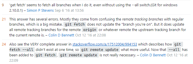 하지만 답변글의 달린 댓글들을 보면, git fetch가 현재 위치한 브랜치만 업데이트한다는 설명이 잘못돼었다고 한다.